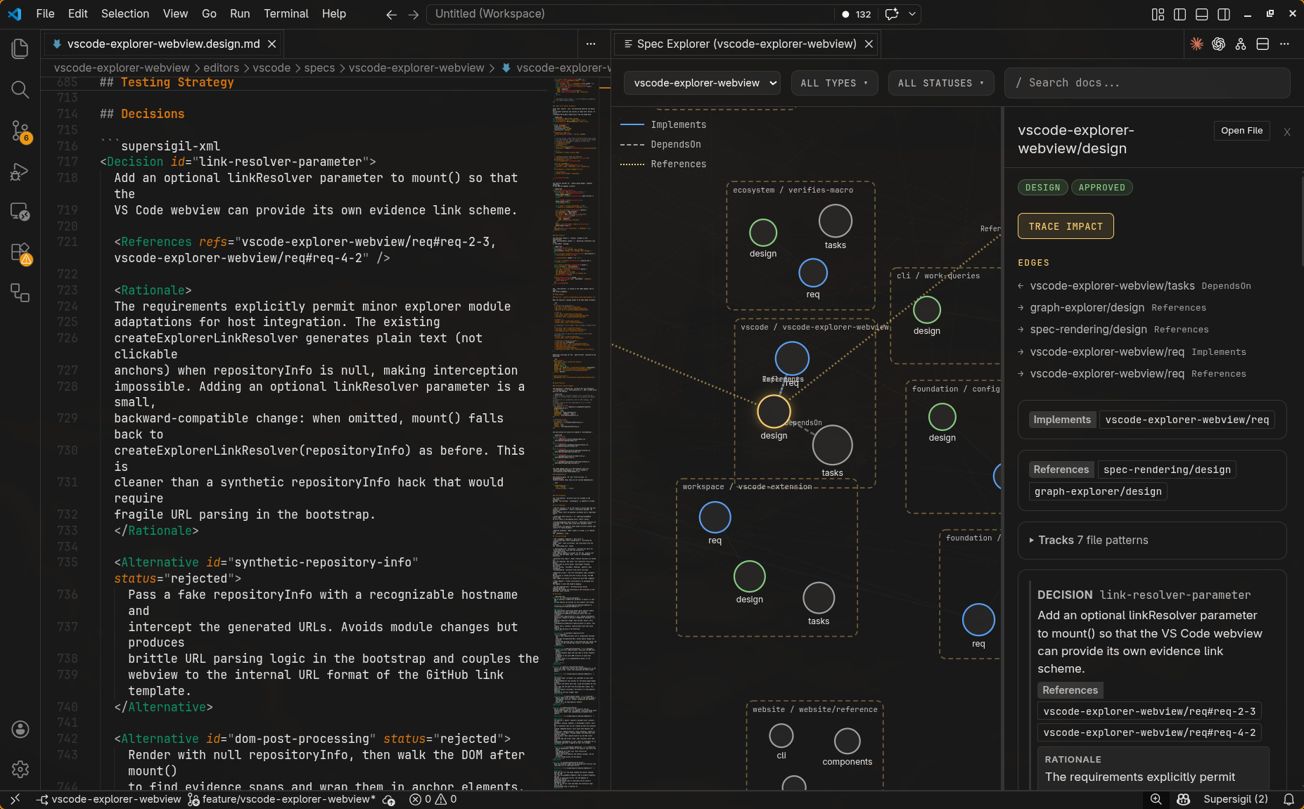 - Supersigil Specifications tree — the Explorer sidebar includes a “Supersigil Specifications” section listing all spec documents grouped by feature area. Hover over a document to see an inline button that opens it in the graph explorer.