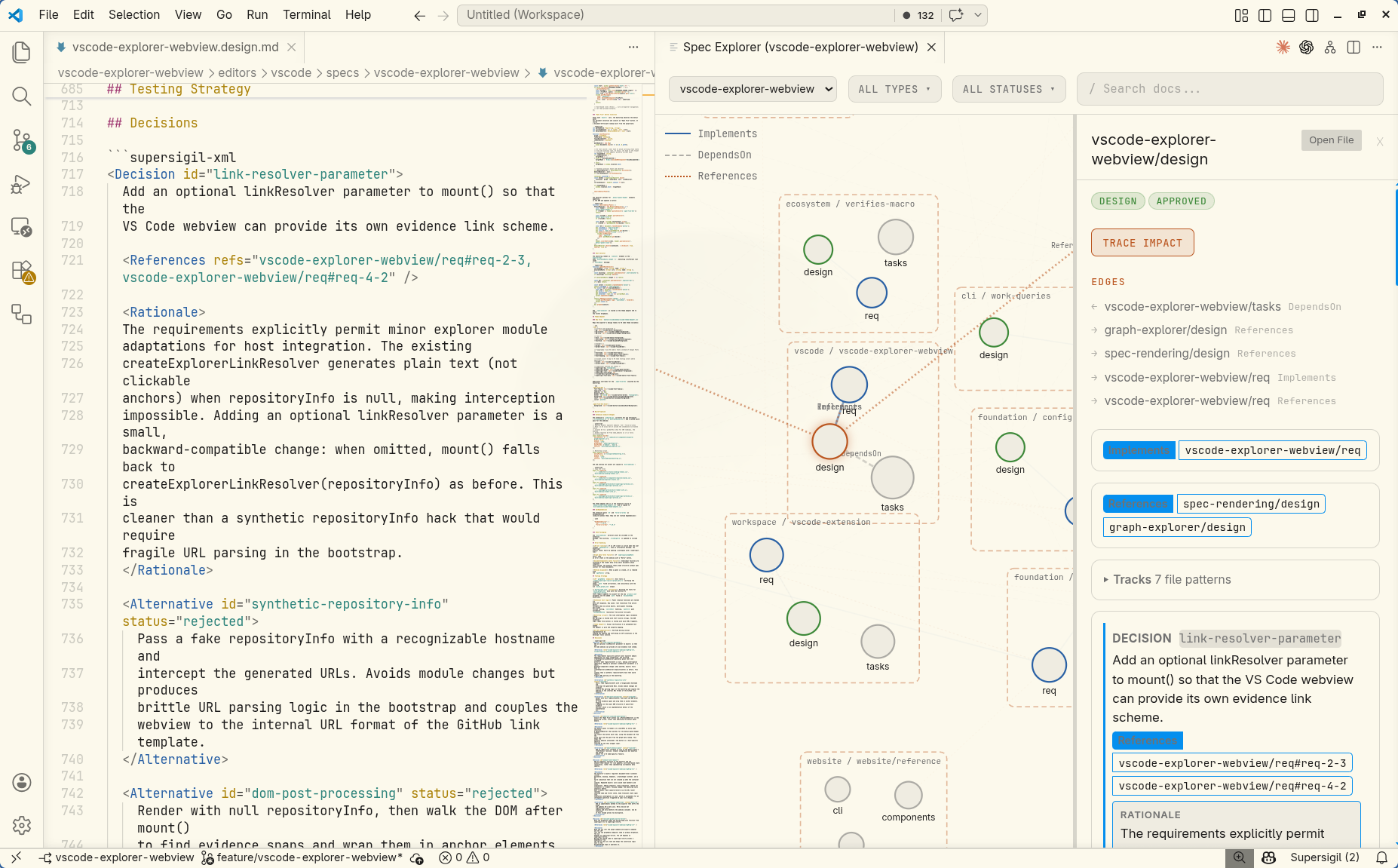 The in-editor graph uses the same D3.js visualization, the same detail panel with rendered spec content, and the same filtering and search as the standalone CLI output and the hosted explorer.